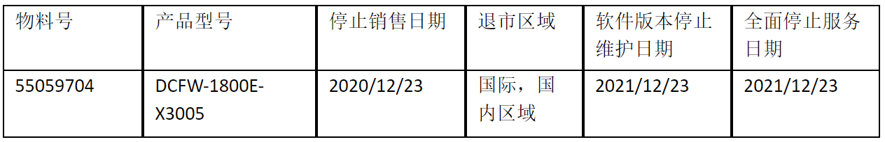 北京金年会诚信至上数码云科信息技术有限公司正式通知您, 以上DCFW-1800E-X3005下一代防火墙(55059704)将于20201223号停止接收新的订单(具体日期见上表),不再供货。给您带来的不便,敬请原谅。